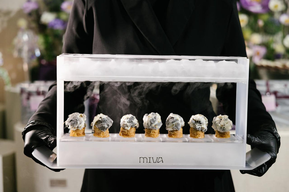 Gelato sereved over baklawa cupsYour choice of gelato served over dry ice